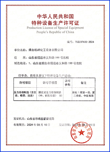 松岭化工专注化工设备行业15年,集科研、开发、设计、 生产于一体的高新技术企业,还具备设计、制造D1、D2类压力容器资质。
